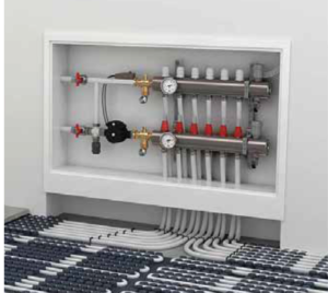 Underfloor radiant systems distribute heat via hot water heated in a boiler. The hot water is pumped into pipes that are installed below the flooring and heats your home by radiating heat through the flooring materials. The water pipe are controlled through a manifold connected to the water pipes loops.